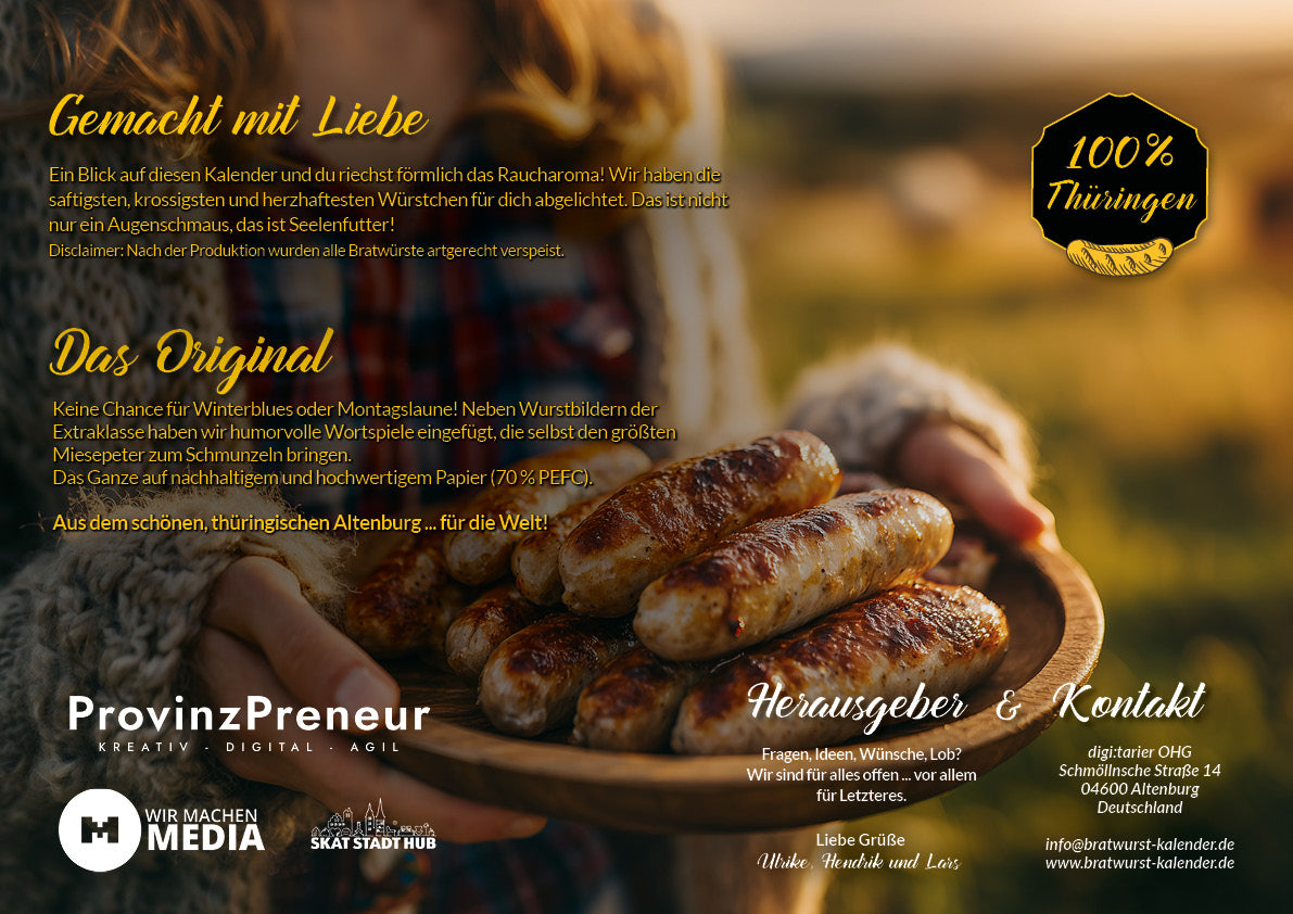 Thüringen, bekannt für seine malerischen Landschaften und tief verwurzelten Traditionen, hat der Welt auch das Geschenk seiner berühmten Bratwürste gemacht. Dieser Kalender ist nicht nur eine Hommage an diese Tradition, sondern auch eine Einladung, den authentischen Grillgeschmack Thüringens zu erleben. Jede Wurst im Kalender wurde mit Leidenschaft und handwerklichem Können hergestellt, um sicherzustellen, dass Sie den echten, unverfälschten Geschmack von Thüringen in jedem Bissen spüren.